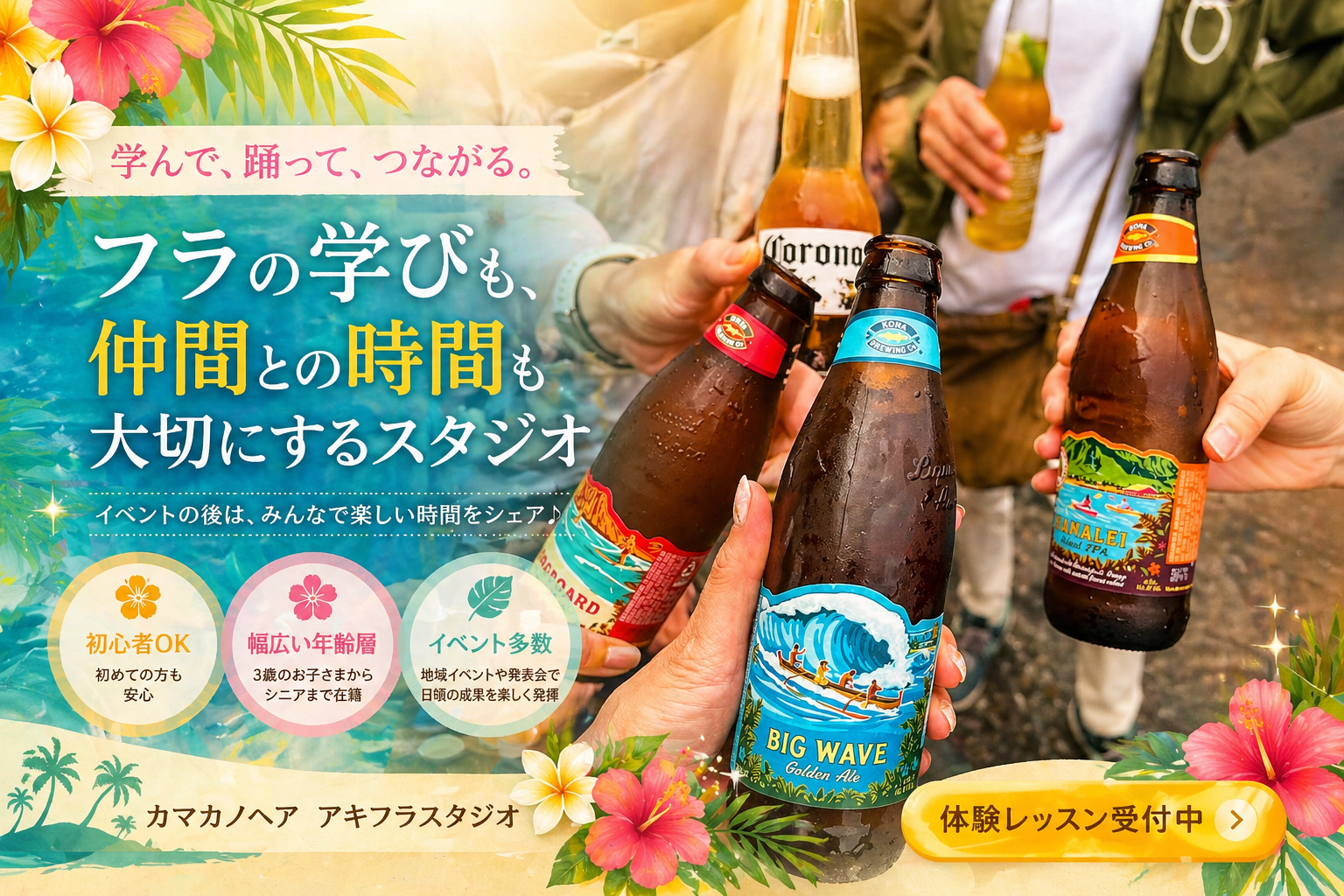心地良いハワイアンミュージックやイプ・イプヘケ等ハワイの打楽器に合わせフラカヒコのステップ・ハンドモーションやオリ・ハワイ語を学び素敵なフラダンサーに❤️